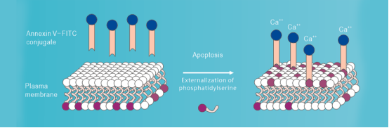 细胞凋亡早期,位于正常细胞膜内侧的磷脂酰丝氨酸(Phosphatidylserine, PS)会翻转到细胞膜表面,暴露在细胞外环境中。Annexin-V是一种分子量为 35~36KD的Ca2+依赖性磷脂结合蛋白,能与PS 高亲和力特异性结合。以荧光标记了的Annexin-V作为探针,利用流式细胞仪或荧光显微镜可检测细胞凋亡的发生。