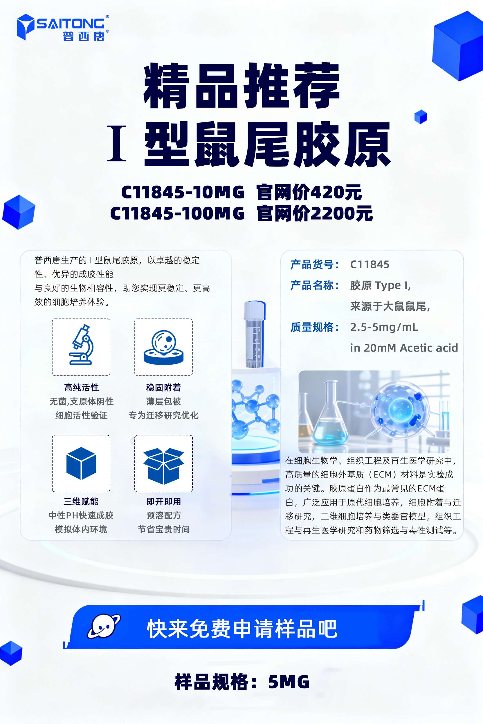 普西唐为您提供高品质 I 型鼠尾胶原,目前还能申请试用装哦~