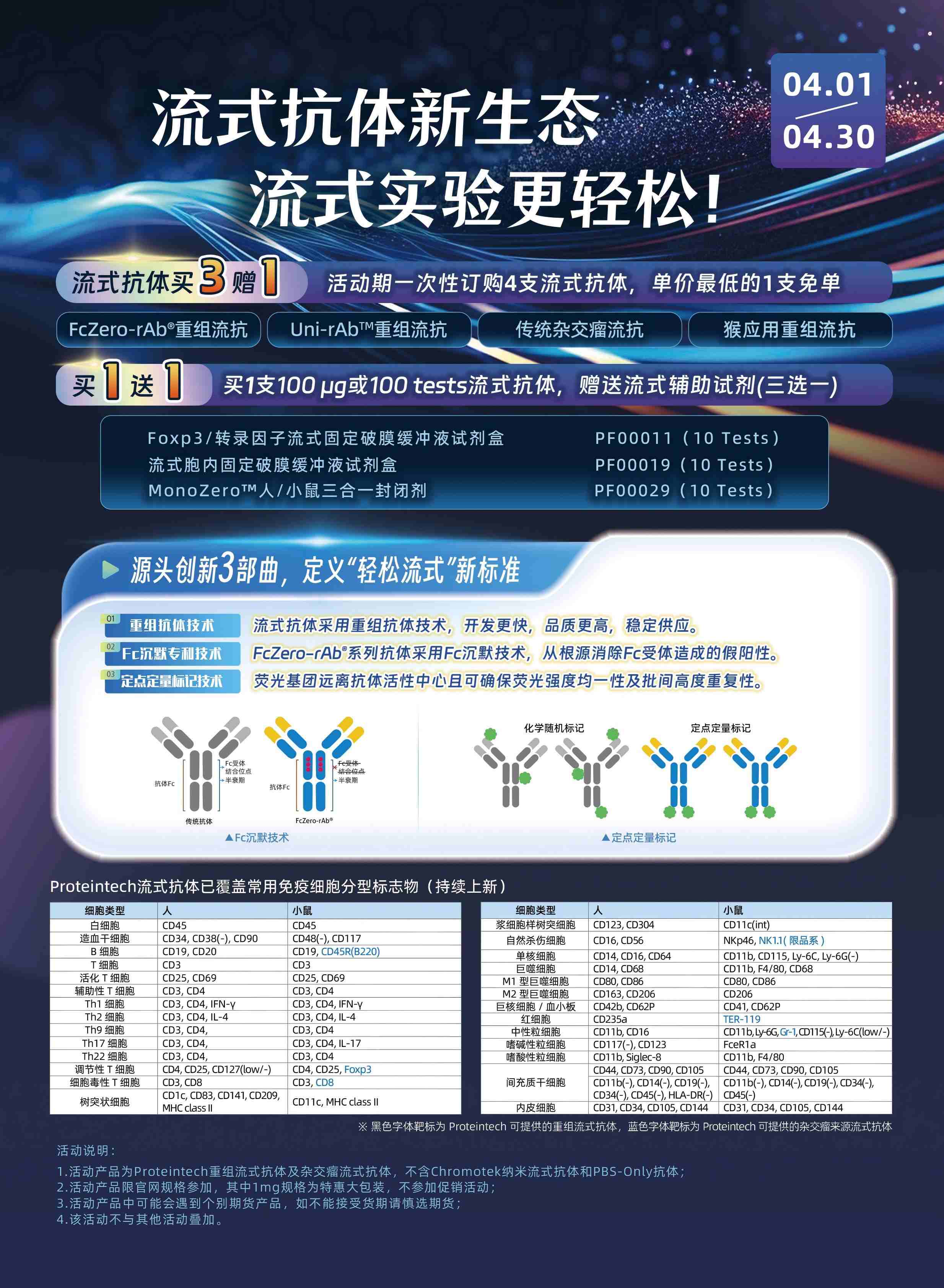 ①流式抗体,买3赠1:活动期一次性订购4支流式抗体,单价最低的1支免单,4000+流式抗体参与活动,丰富大家的抗体库;覆盖热门研究靶点!